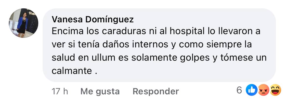 Algo que llamó la atención fue que los profesionales que acudieron en la ambulancia departamental, no quisieron trasladarlos al Centro de Salud ni al Hospital Rawson, a fin de que le realizaran estudios, para ver que no tuvieran daños internos. «Solo lo revisaron así nomas, le dijeron son golpes y que tomara calmantes» afirmaron los testigos presentes.