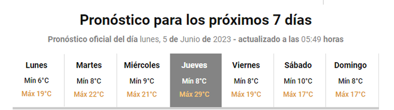 Jueves: será el día más caluroso de la semana. La mínima será de 8°, pero la máxima alcanzará los 29°. Correrá viento del dirección del Norte con ráfagas que no superarán los 22 kilómetros por hora.