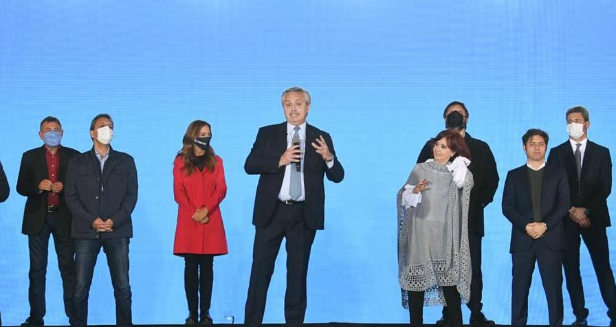 El presidente de la Nación, Alberto Fernández, y la vicepresidenta, Cristina Fernández, fueron los principales oradores del acto donde se lo pudo ver al gobernador de San Juan, Sergio Uñac, junto a otros gobernadores del Frente. Fueron acompañados por dirigentes, precandidatos, precandidatas y militantes de todo el país.