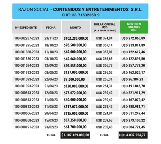 Mientras que lo percibido por Contenidos y Entretenimientos SRL (CUIT: 30-71590598-8) fue de $1.107.469.000 que en moneda estadounidense es de US$ 4.037.254,77. Un dato no menor es que la cifra percibida por ambas empresas durante el 2023, que fue de US$ 14.599.447, da un número impensado para cualquier asalariado sanjuanino al ser pesificada al día de hoy con un dólar oficial de $854. Esto da $12.467.927.738.