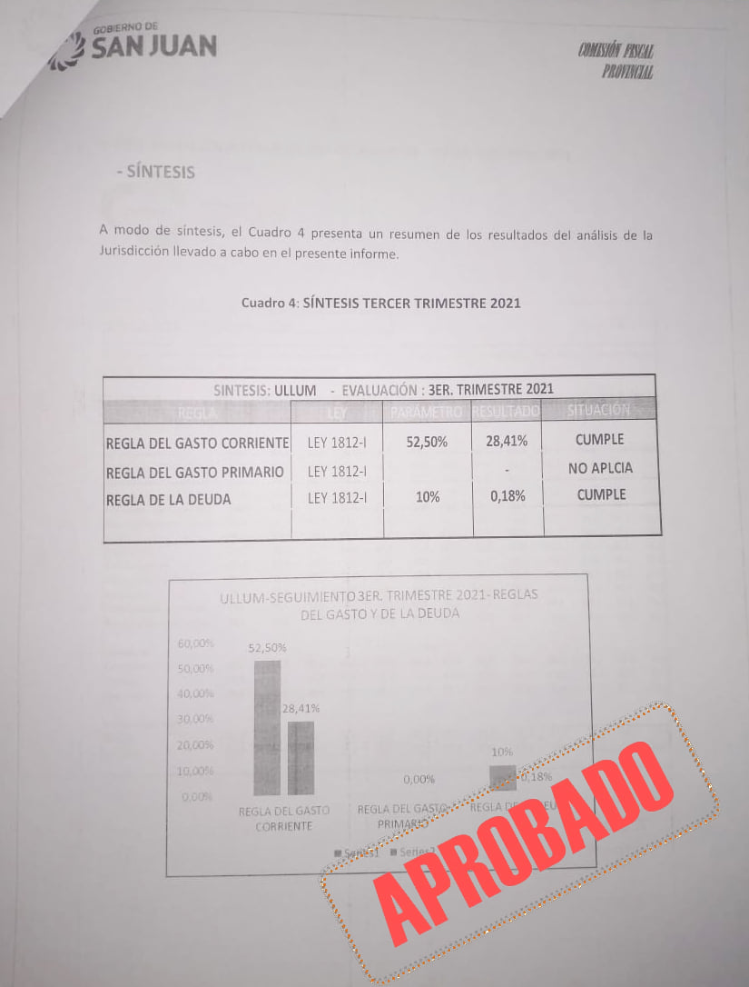 Una vez mas, desde la Secretaría de Hacienda y Finanzas Municipal dieron a conocer a toda la población la transparencia institucional de la Municipalidad de Ullum, quienes recibieron nuevamente la aprobación de las cuentas de reglas fiscales dispuestas por el Ministerio de Hacienda de la Provincia, y las que pertenecen al tercer trimestre, al igual que las del primer y segundo trimestre de la nueva ley de coparticipación establecida en la gestión del Gobernador Sergio Uñac.