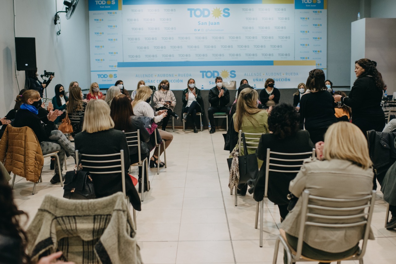 En una de las últimas actividades antes del cierre de la campaña de cara a las PASO del próximo domingo. Sergio Uñac se reunió con mujeres referentes del Frente de Todos. Del encuentro participaron las precandidatas Fabiola Aubone, Marita Benavente y Noelia Tortarolo. También estuvieron presentes las titulares de la Rama Femenina del Partido Justicialista, Marcela Monti, Fernanda Paredes y Silvia Pérez y las ministras Alejandra Venerando, Marisa López y Claudia Grynzspan. Como así también la vicepresidenta del Partido Justicialista, Daniela Rodríguez y mujeres de cada una de las juntas departamentales de toda la provincia.