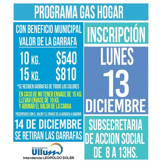 Tal como lo informaron en la pagina oficial de la Municipalidad de Ullum, desde la Subsecretaría de Acción Social informó que se encuentran disponibles las inscripciones para la compra de gas en garrafa del Programa Hogar, el cual cuenta con el beneficio municipal.